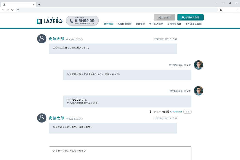 商談内容はすべて履歴に残るため、商談状態を一覧で確認できます。また、チャット上で画像・見積書などのデータも送受信できるので、ラセロだけで商談を管理できます!